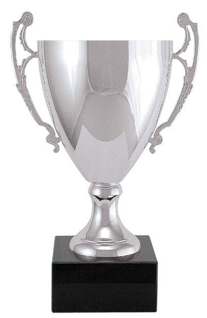 11 3/4" small silver cup with a heavy black marble base. The black aluminum engraving plate is attached to the front of the marble base. (Actual cup is not engravable)