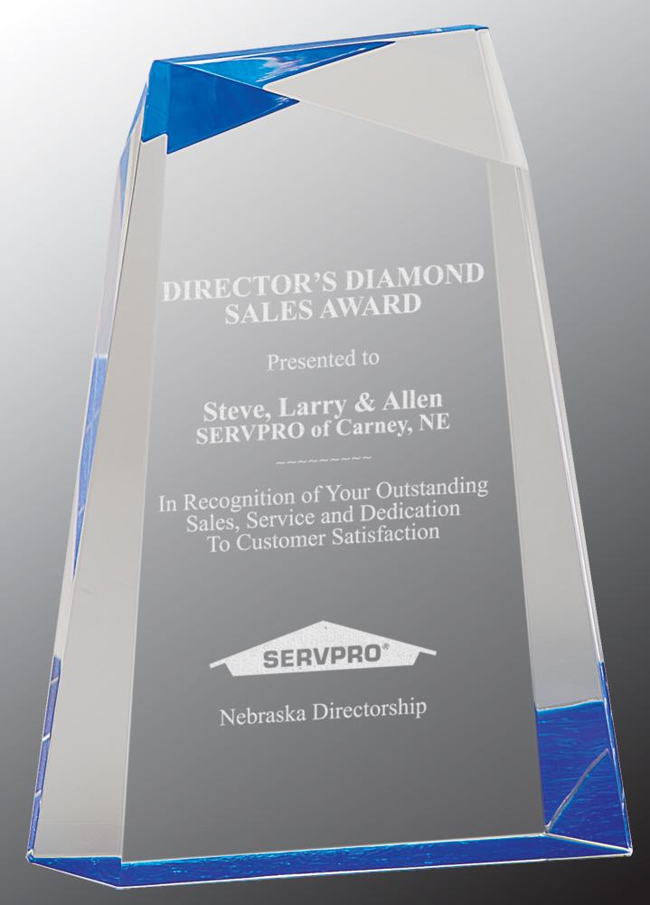The Blue Wedge Facet acrylic is almost one inch thick and commands attention while it free stands as a pillar of strength.