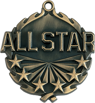 Highly detailed medal with wreath border and All Star 3D look. Available in gold. (Silver and bronze are available by special order; please contact us directly for more information.) Your choice of pin drape or neck ribbon.