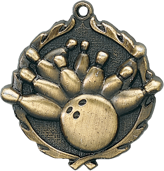 Highly detailed Bowling medal with wreath border and 3D look. Available in gold. (Silver and bronze are available by special order; please contact us directly for more information.) Your choice of pin drape or neck ribbon.