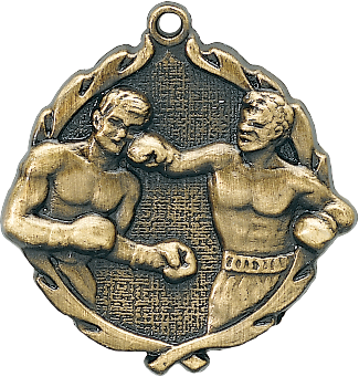 Highly detailed Boxing medal with wreath border and 3D look. Available in gold. (Silver and bronze are available by special order; please contact us directly for more information.) Your choice of pin drape or neck ribbon.
