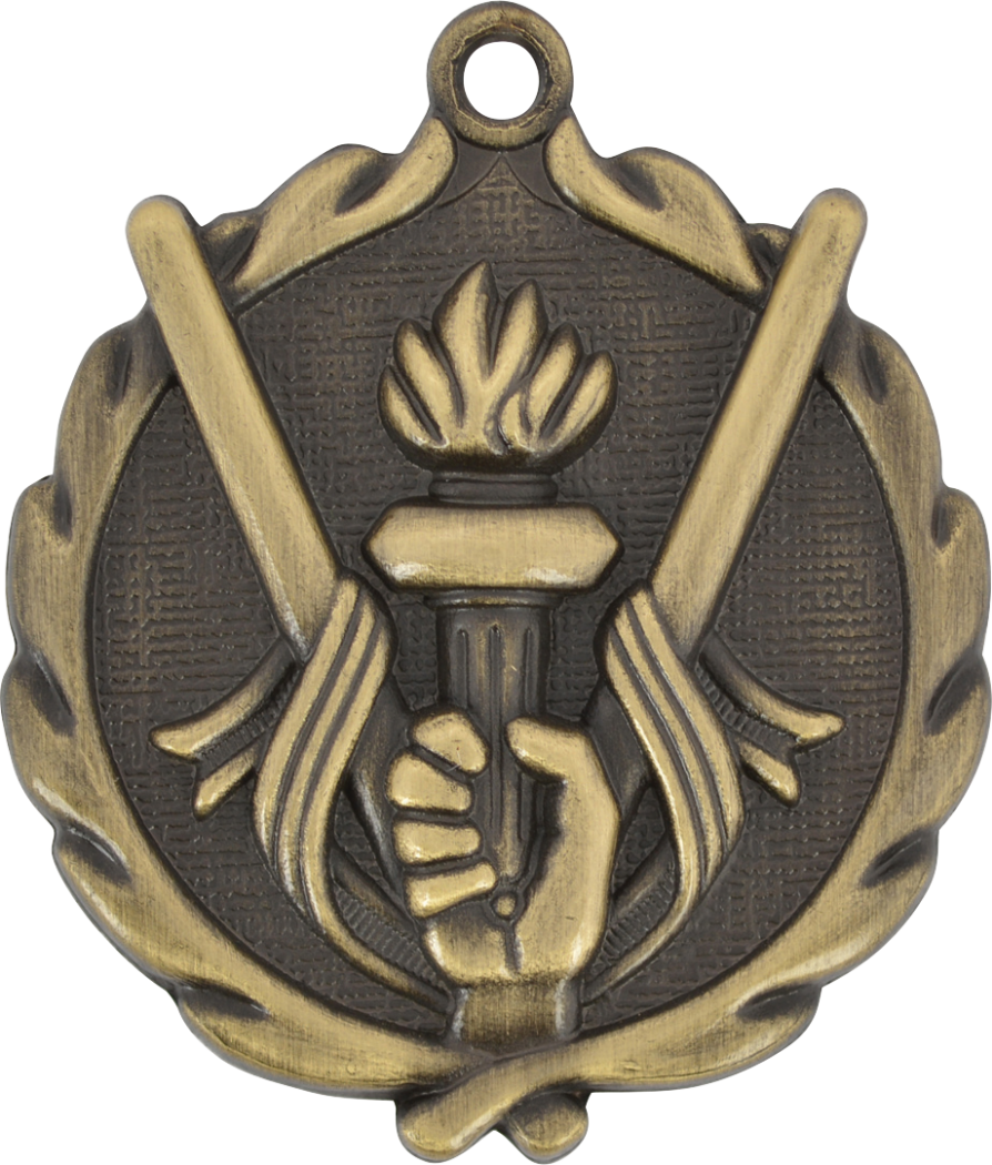 1 3/4" Highly detailed wreath border medals. Available in gold. (Silver and bronze are available by special order; please contact us directly for more information.) Your choice of pin drape or neck ribbon.